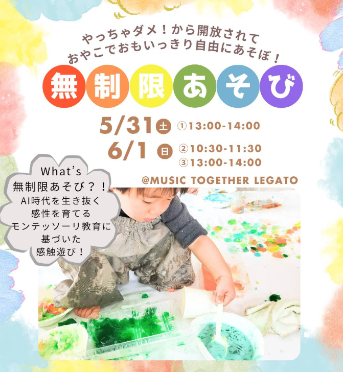 モンテッソーリ教育に基づいた 五感を使って思いっきり自由に遊ぶ、感触あそびのイベントです❕